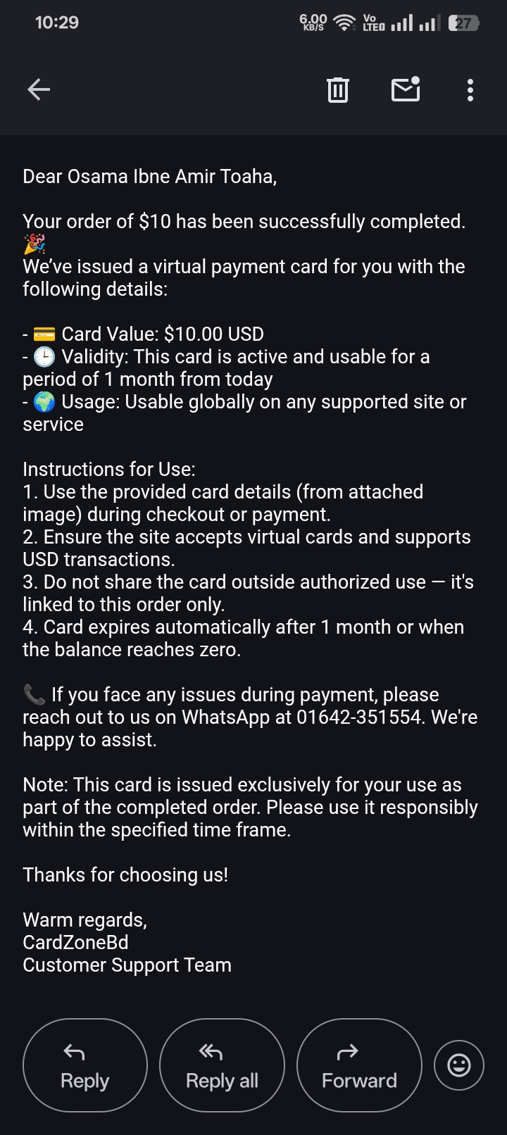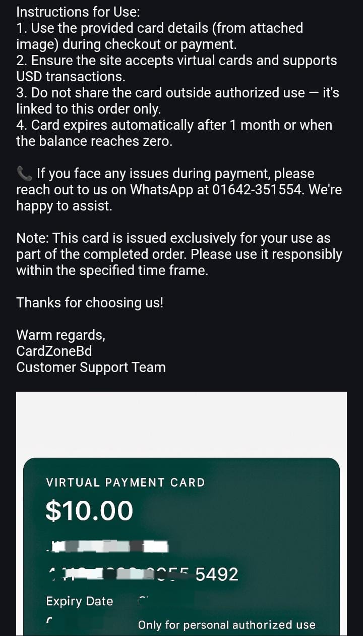 Upon successful payment, you receive your virtual card instantly via email, along with the activation link and instructions. No shipping, no waiting.